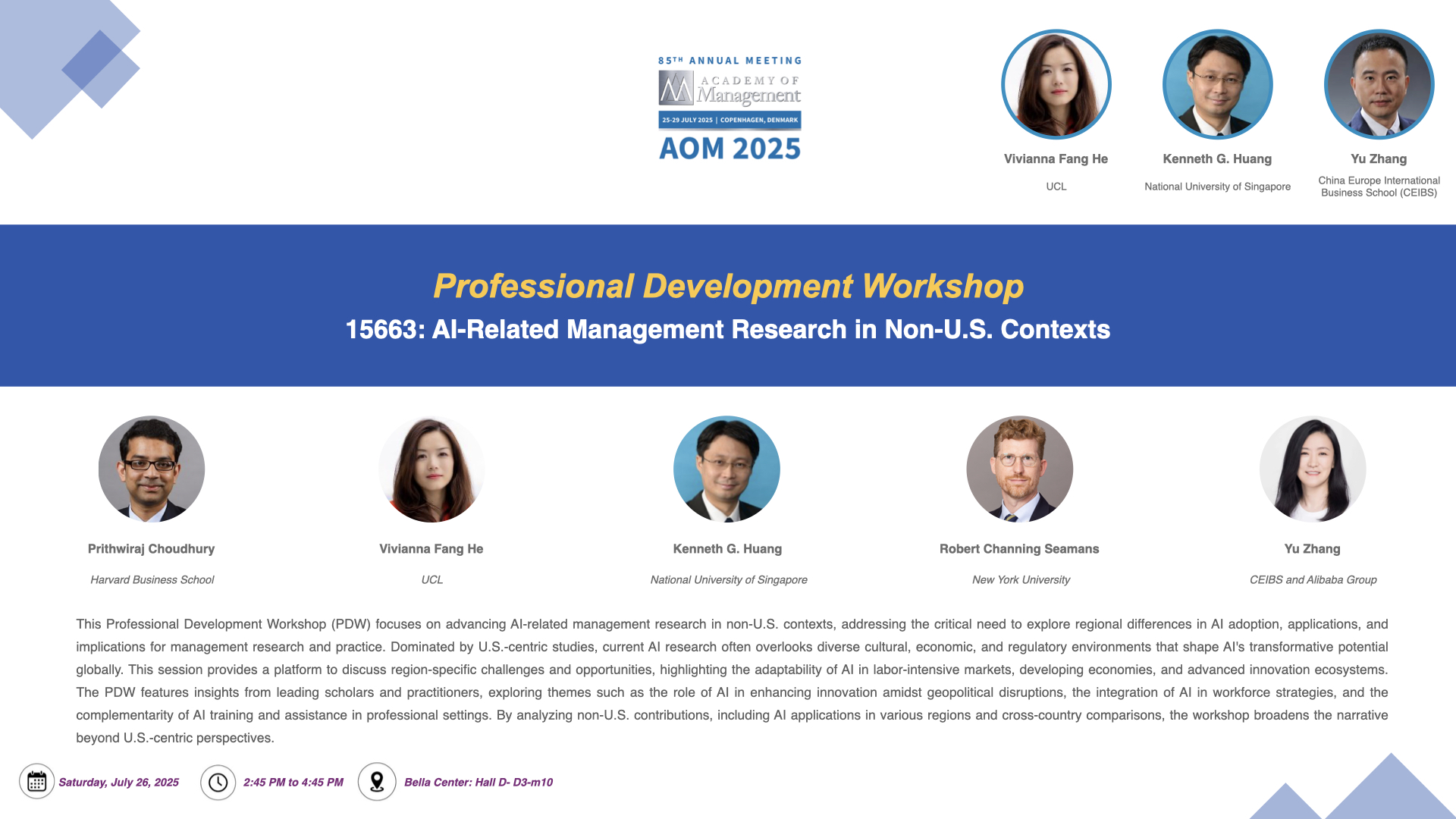 We (Vivianna Fang, Kenneth Huang, Yu Zhang) are thrilled to be co-organizing a PDW at AOM on AI-Related Management Research beyond the U.S. Contexts. Our PDW will showcase latest research not only from the U.S., but also from China, Germany and Turkey.