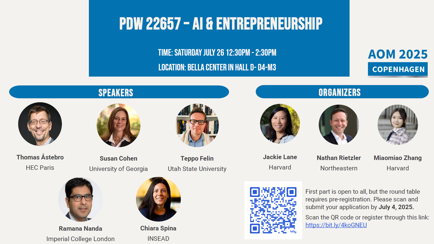 Join us at AOM Copenhagen for the PDW on AI & entrepreneurship! We bring together leading scholars to discuss how AI is reshaping the way entrepreneurs learn, experiment, and grow-and how evaluators assess ideas, teams, and potential.
