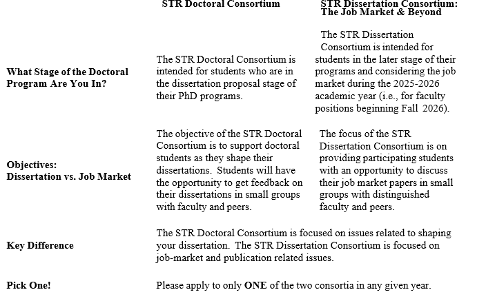 The STR Dissertation Consortium is intended for those PhD students who are in the advanced stages of their programs and who are considering the job market during the 2025-2026 academic year (i.e., for faculty positions that begin in Fall 2026). The focus of the STR Dissertation Consortium will be on providing participating students with an opportunity to discuss their job market papers and 'elevator pitches' about their research identity in small groups with distinguished faculty and peers for high-quality, developmental feedback. We will also be using breakout groups during coffee breaks to facilitate student networking.