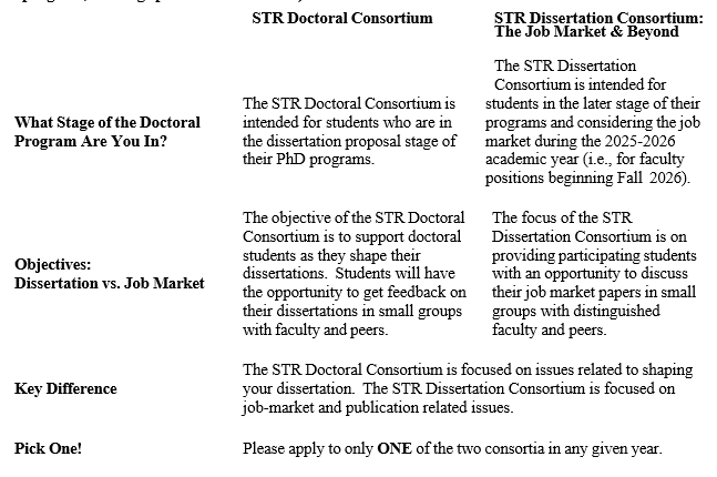 The STR Dissertation Consortium is intended for those PhD students who are in the advanced stages of their programs and who are considering the job market during the 2026-2027 academic year (i.e., for faculty positions that begin in Fall 2027). The focus of the STR Dissertation Consortium will be on providing participating students with an opportunity to discuss their job market papers and 'elevator pitches' about their research identity in small groups with distinguished faculty and peers for high-quality, developmental feedback. We will also be using breakout groups during coffee breaks to facilitate student networking.